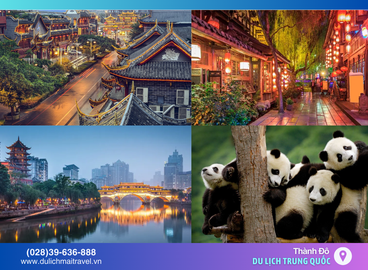 Thủ phủ tỉnh Tứ Xuyên, Thành Đô là điểm đến không thể bỏ qua nếu bạn yêu động vật và ẩm thực. Hãy đến Cơ sở Nghiên cứu Gấu Trúc để chiêm ngưỡng những chú gấu trúc đáng yêu, khám phá phố cổ Cẩm Lý nhộn nhịp, thưởng thức lẩu Tứ Xuyên cay xè và trà quán truyền thống. Thành Đô còn là cửa ngõ để khám phá thêm Cửu Trại Câu. Với tour của M.A.I Travel, bạn sẽ được hướng dẫn tận tình để thưởng thức trọn vẹn hương vị đặc trưng Tứ Xuyên.
