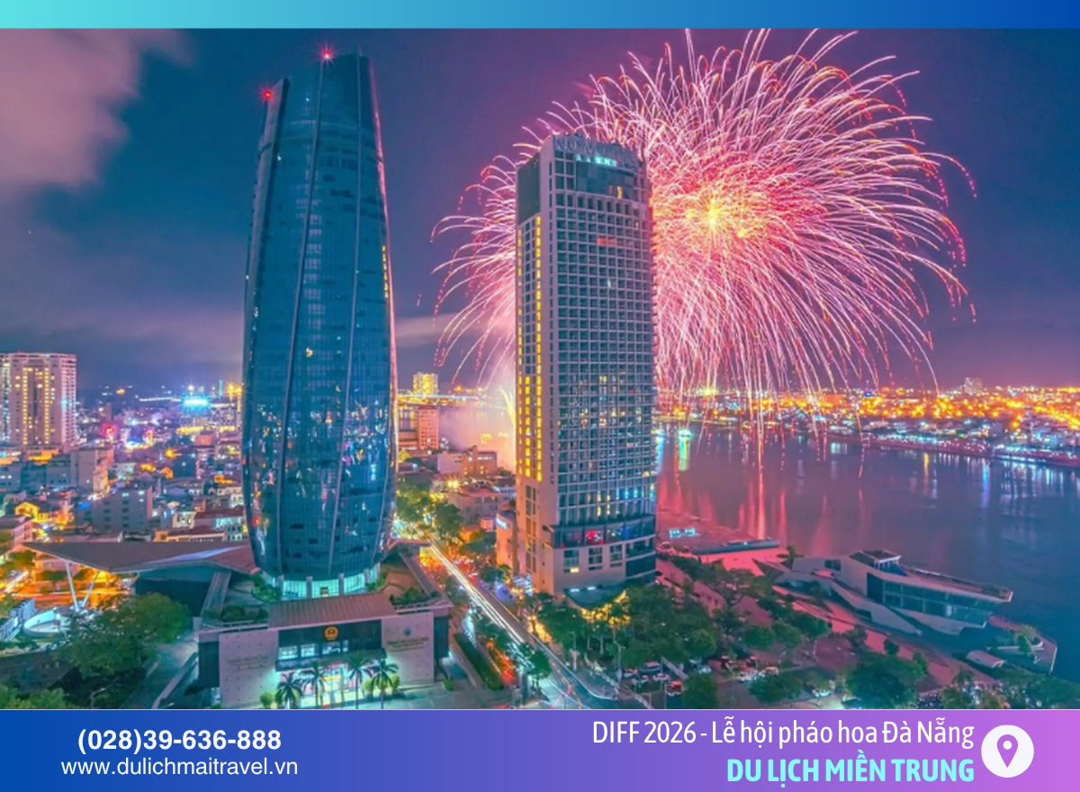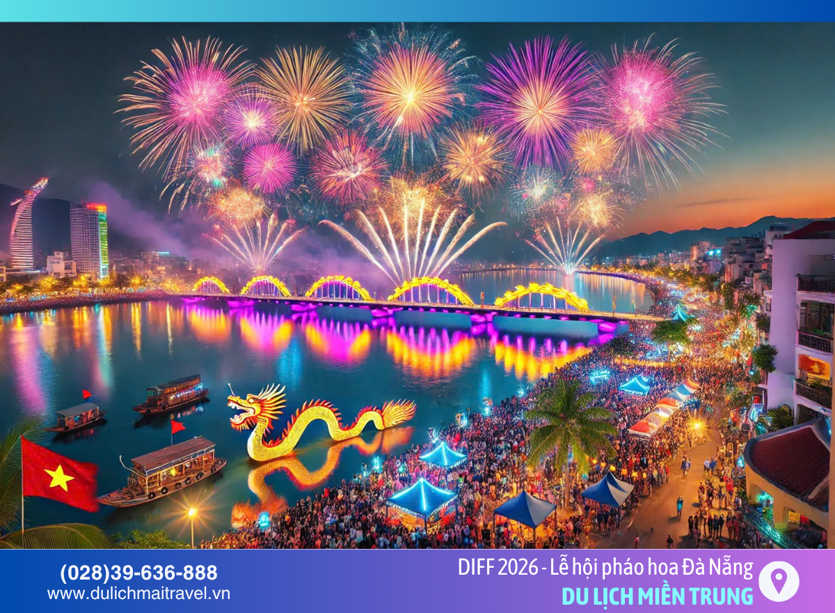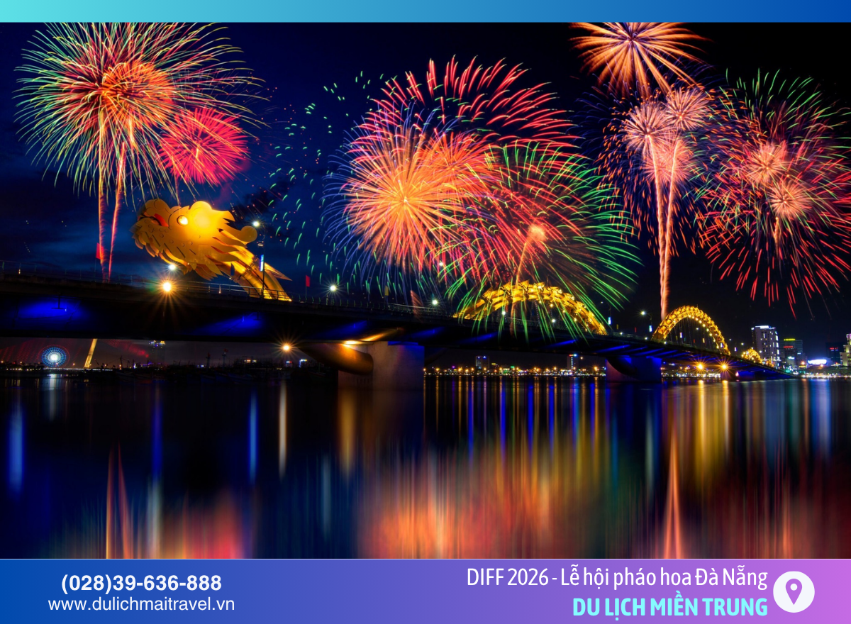 Cập nhật lịch xem Lễ hội pháo hoa quốc tế Đà Nẵng (DIFF) 2026 mới nhất, địa điểm bắn pháo hoa, góc ngắm đẹp và kinh nghiệm di chuyển chi tiết. Đặt tour Đà Nẵng trọn gói cùng M.A.I Travel ngay!