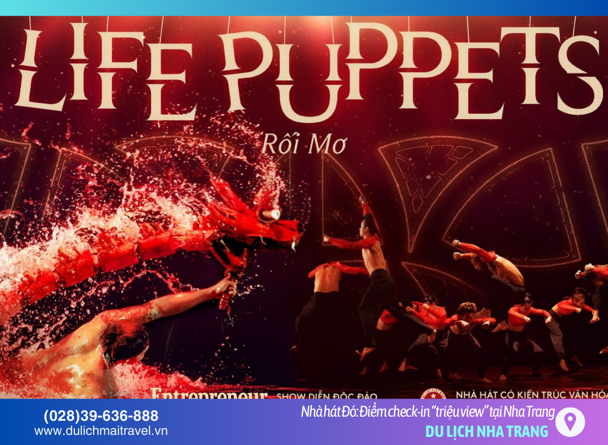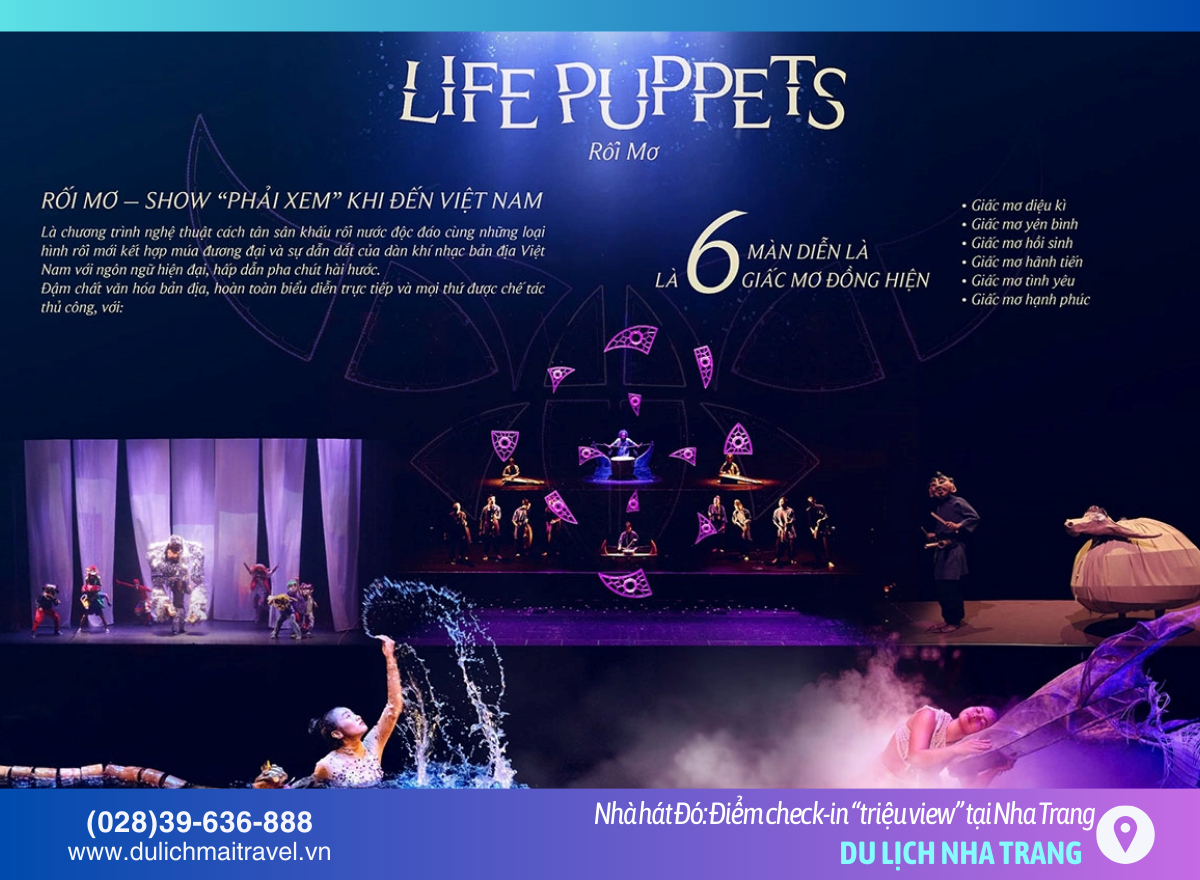 Không chỉ gây ấn tượng bởi kiến trúc độc bản, Nhà hát Đó Nha Trang còn là “thánh đường” của show diễn “Life Puppets – Rối Mơ” – một kiệt tác nghệ thuật đầy tự hào. Khác biệt hoàn toàn với múa rối nước truyền thống sau màn che, “Rối Mơ” phá bỏ mọi giới hạn để mang đến một trải nghiệm thị giác và thính giác hoàn toàn mới lạ.