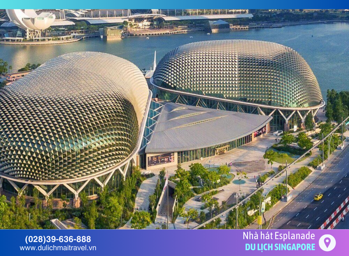 Nhà hát Esplanade (Esplanade – Theatres on the Bay) được mệnh danh là "nhà hát trái sầu riêng" nhờ thiết kế mái vòm gai góc đặc trưng, là một trong những công trình kiến trúc biểu tượng nhất của Singapore. Nằm ngay trung tâm vịnh Marina Bay, nơi đây không chỉ là trung tâm biểu diễn nghệ thuật hàng đầu mà còn là điểm check-in không thể bỏ lỡ khi du lịch đảo quốc sư tử.
