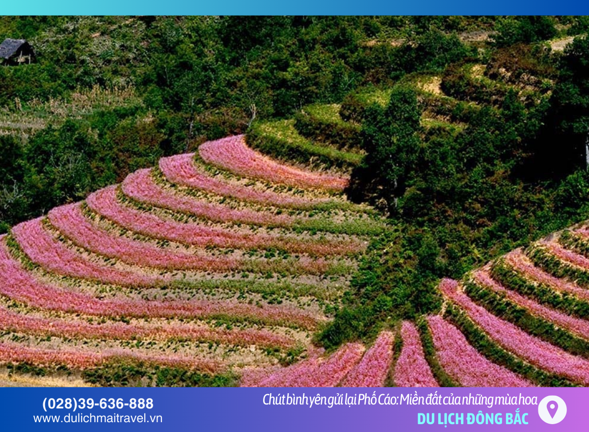 - Tháng 10 - Cuối tháng 11: Phố Cáo khoác lên mình “chiếc áo” dệt từ sắc tím, trắng và hồng của những cánh đồng hoa tam giác mạch – đặc sản tinh thần của cao nguyên đá Hà Giang.