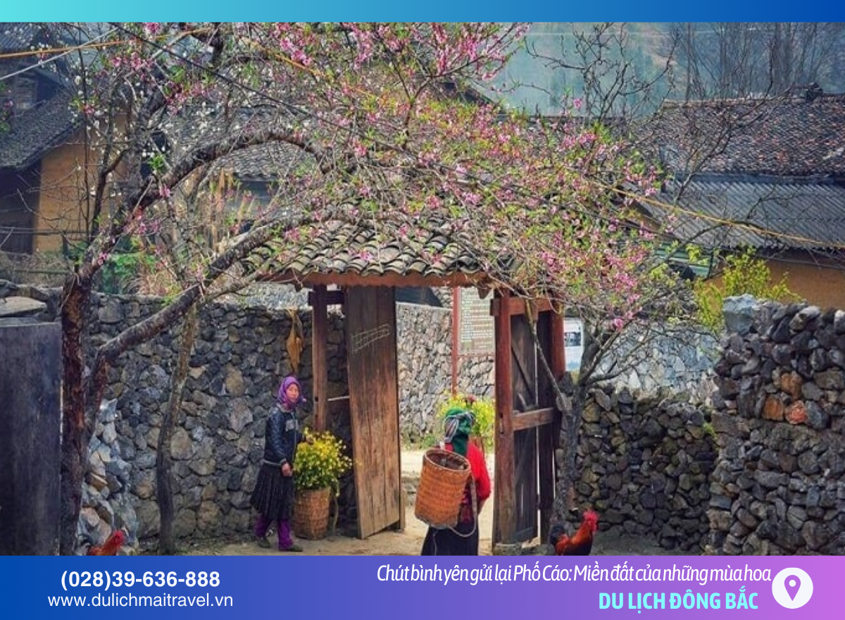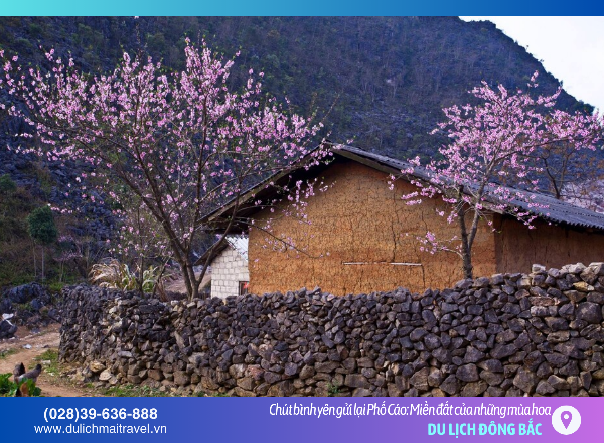 - Sắc xuân: Rực rỡ với màu hồng của hoa đào, hoa mận nở rộ bên những hàng rào đá.